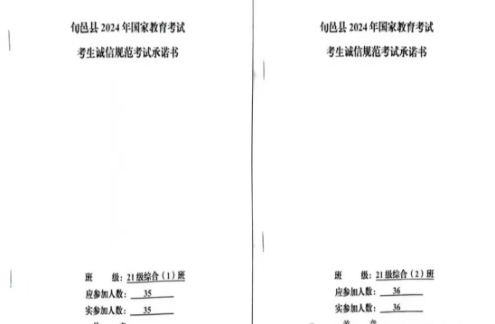 三是签订书面承诺。组织学生签署《旬邑县2024年国家教育考试考生诚信规范考试承诺书》《旬邑县2024年国家教育考试高考考生携带电子通讯设备进入考点后果知晓书》,以书面形式告知学生,要自觉遵守《考生守则》和《考场规则》,不得将手机等无线电设备带进考点,并用严格的安检程序和严厉的处罚措施警醒考生,打消作弊念头,消除侥幸心理,落实诚信考试。