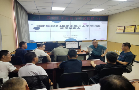 6月19日咸阳市武功考区在考管中心的监控室召开考务、司铃、广播、视频监考、保密工作、监线等人员的分层、分类、分岗培训会。