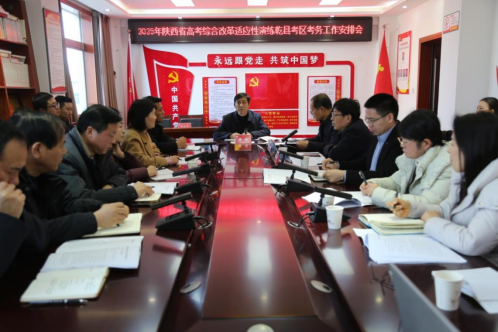 2025年是陕西省新高考第一年,为确保新高考平稳顺利,陕西省高考综合改革适应性演练将于2025年1月3日至5日进行。咸阳市乾县考区共有考生3618人,设乾县第一中学、乾县第二中学两个考点,131个考场。2024年12月26日上午,2025年陕西省高考综合改革适应性演练乾县考区考务工作安排会在教育局四楼召开。参加会议的有教育局全体领导、纪监组书记、考点主考、副主考等涉考负责人、相关中学校长及招生办领导和部分同志。