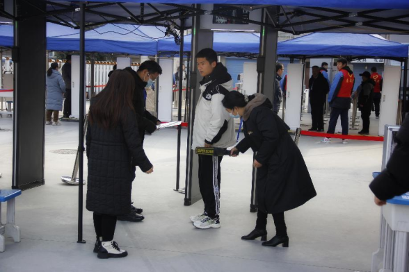 工作人员认真对考生进行智能安检门和金属探测仪检测