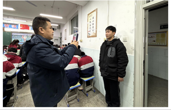 在信息采集现场,电教处工作人员深入各班教室依次有序进行人像信息采集,时时提醒学生注意着装得体、整理发型、摘下眼镜等事项,并指导学生完成信息采集的每道工序。