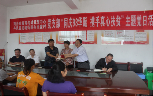 在中国共产党成立98周年纪念日到来之际,商洛市教育考试管理中心在包扶的丹凤县龙驹街道办代庄村开展了“同庆98华诞,携手真心扶贫”主题党日活动,共庆建党98周年。