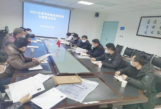 会上,县医院体检负责人对2021高考体检工作进行了详细小结,并对体检过程中存在的重大疑难问题、异常情况和遗留问题进行了梳理汇总。本着“为考生负责,为国家选才”的原则,专家组成员分别从各自专业角度对考生体检存在的异常结果和病情进行了详细解答,对意见分歧进行了现场讨论统一,就考生身体实际情况商定后拿出最终体检结论,并告知相关中学将考生病情如实通知到考生本人并做好后续治疗工作。县医院副院长田军同志对专家组成员给出的体检结论表示肯定,对全体参检医护人员的辛勤付出表示高度赞扬。