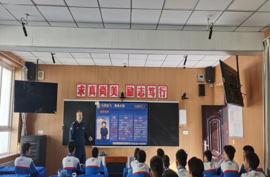 会中,同学们观看了有关空军招飞的宣传片。随后,空军招飞局兰州选拔中心张润元老师对空军青少年航校和空军航空大学进行了详细介绍,对航校选拔标准及培养模式做了细致全面地讲解,并对身高和体重符合标准的同学进行了视力测试。同学们认真聆听,积极提问,报告会激发了同学们立志蓝天、成就梦想的热情。